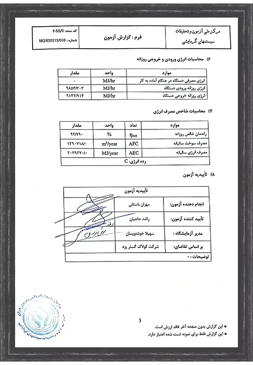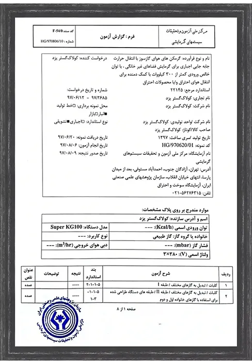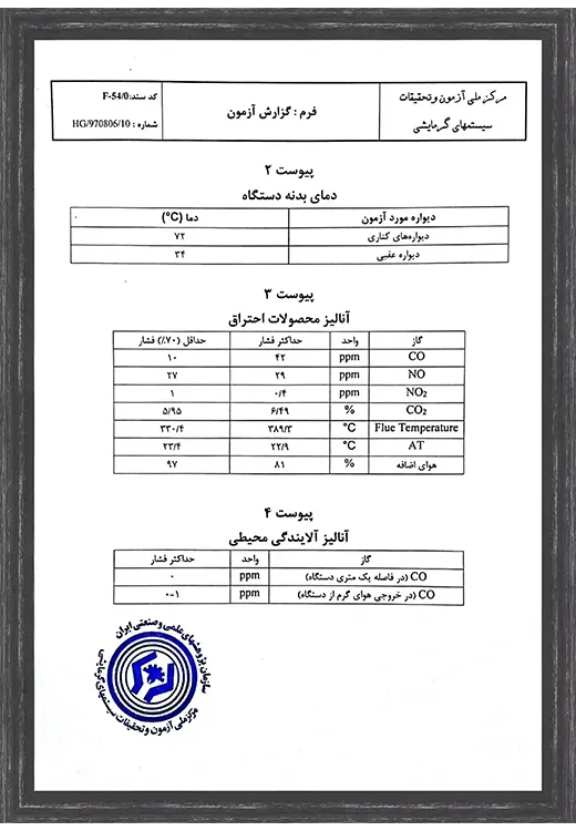 - تنها دارنده گواهینامه عدم وجود آلاینده (مونواکسید صفر) در خروجی هوای گرم بخاری های خانگی و کورههای هوای گرم صنعتی از مرکز ملی آزمون و تحقیقات سیستمهای گرمایشی ایران
