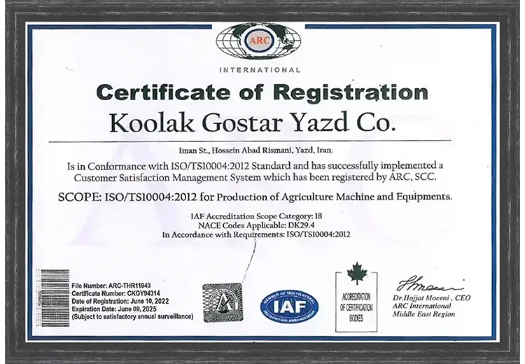 - دارای گواهینامههای بین المللی ایزو 9001، 10004، 18001، 14001 و تأییدیه اتحادیه اروپا (CE)