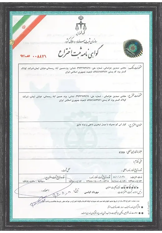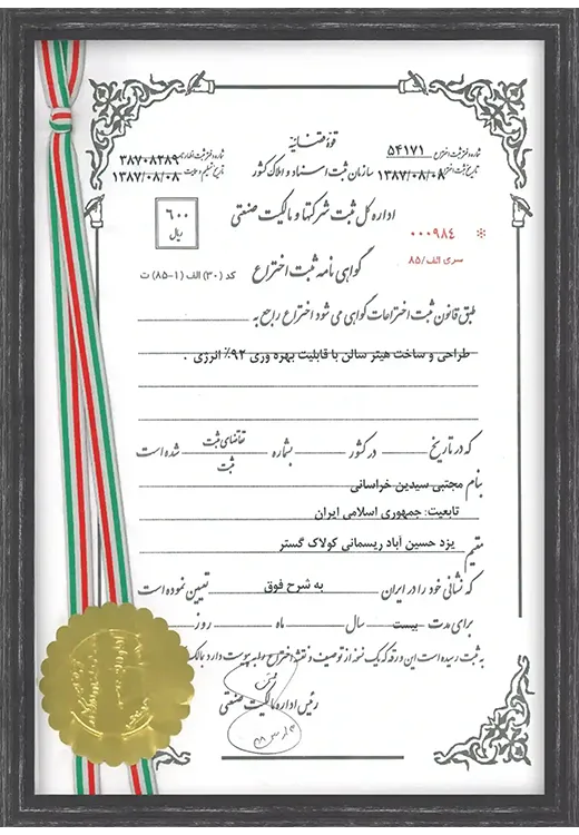 - کسب گواهی ثبت اختراع به شماره ۵۴۱۷۱ در طراحی و تولید هیتر سالن با بهرهوری انرژی ۹۲%